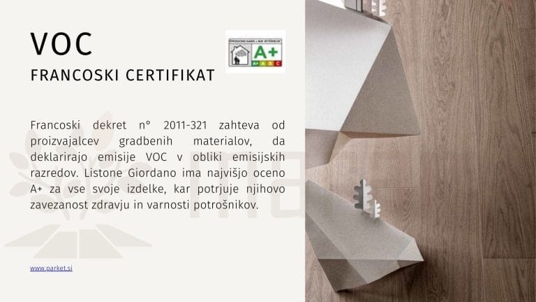 Certifikati kot so FSC, PEFC, A+ in F4 Stars zagotavljajo, da gre za preverjeno varne materiale. Blagovna znamka Listone Giordano gre tukaj še korak dlje. Antibakterijski premaz Crystalcare in proizvodnja po standardu "zero emission" potrjujeta najvišjo raven zdravju prijazne obdelave.