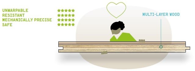 Dvoslojni gotovi parket ima optimalno strukturo, kjer se zgornji sloj iz plemenitega lesa dopolnjuje s stabilnim spodnjim slojem iz brezove vezane plošče. Ta kombinacija omogoča učinkovito prevajanje toplote in hkrati preprečuje deformacije zaradi temperaturnih sprememb.